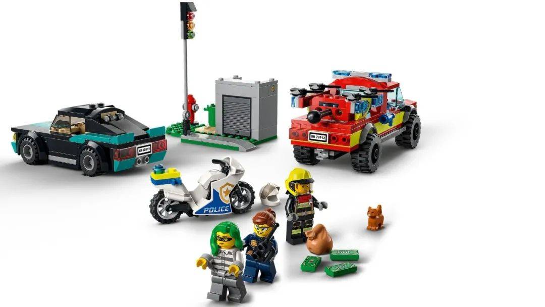 乐高城市60319消防救援与警察大追捕套装结合了消防队和警察的主题。其中包括一个坏蛋驾驶她的逃跑车辆——一辆跑车,绕过交通灯,导致一个变压器站起火。除了一辆带无人机的消防队皮卡车外,一辆警用摩托车也在追捕现场。无人机的新“圆饼积木”零件是透明的,应该是代表水。这个总共295个零件和3个人仔的套装的零售价为29.99欧元。