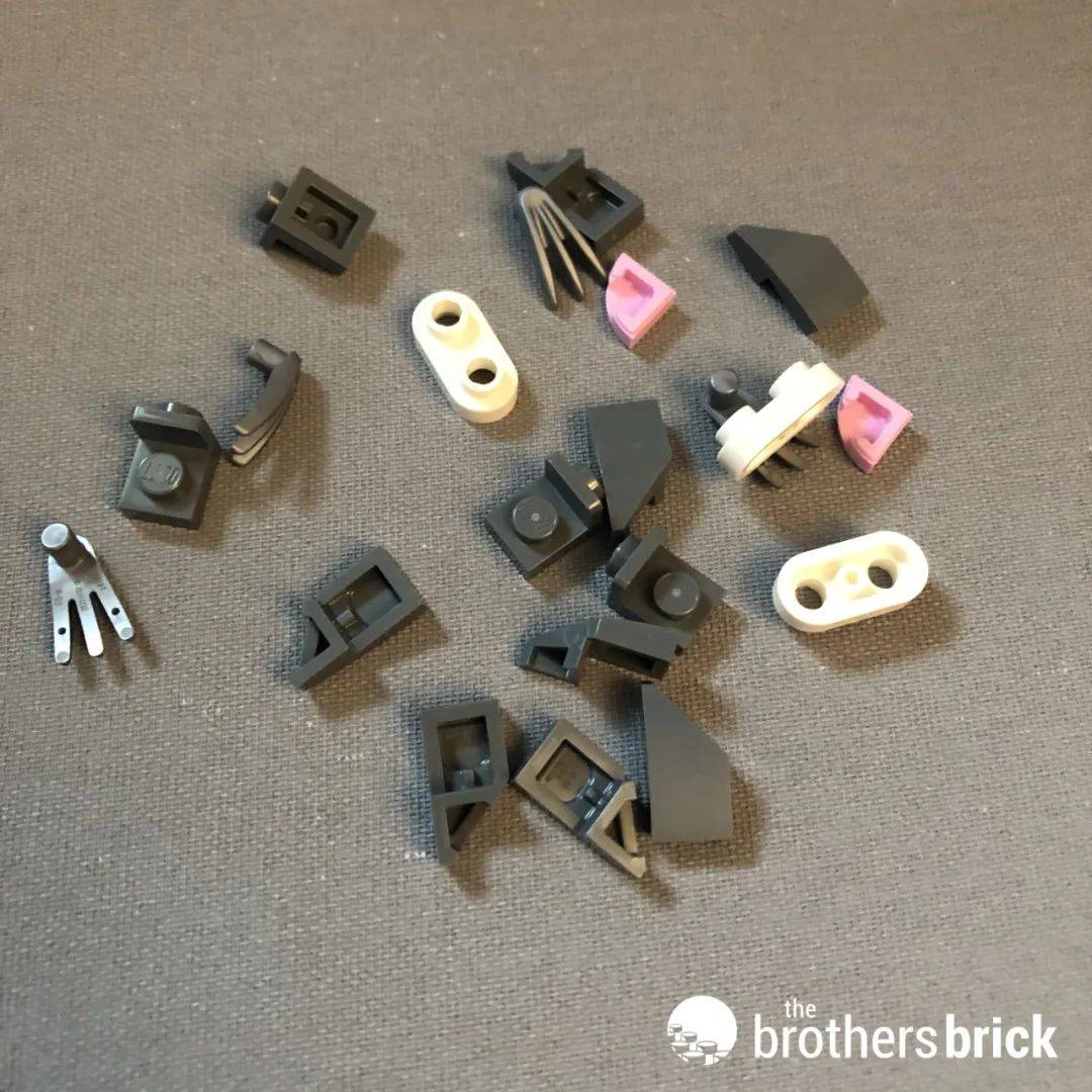 基本上和所有方头仔套装一样,很有多侧面带螺柱的砖块,包括一些浅灰色两面都带螺柱的1×1颗粒。还有几个爪子元素用来做胡须。