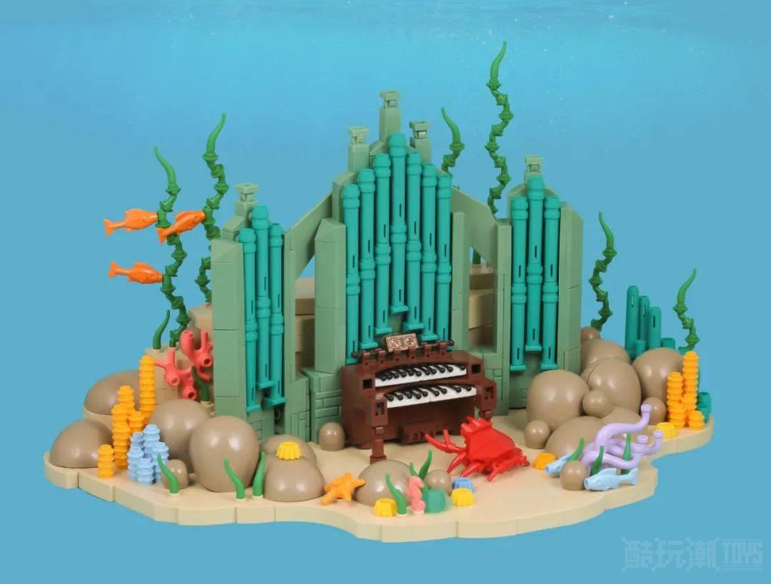 这是由Eli Willsea制作的水下乐高风琴。它的中心是作为管风琴管道的圆柱形部件,也就是本轮钢铁建造者的种子部件。这个特殊部件的缝隙使它非常适合这个乐器,绿松石的颜色也很特别。琴键旁的小螃蟹很可爱,或许它是这架钢琴的演奏者?据推测,这是在向《小美人鱼》中的塞巴斯蒂安致敬。