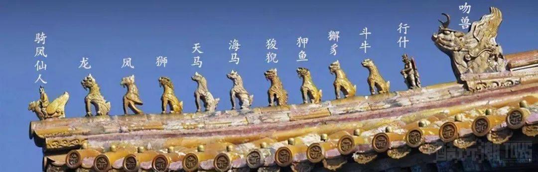 不光太和殿,故宫古建筑所有的屋顶,在垂脊部位,最前面都有一个仙人骑凤的造型,后面则整齐有序地排列着各种瑞兽,其主要寓意是消灾驱邪,护佑宫殿。