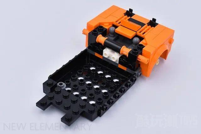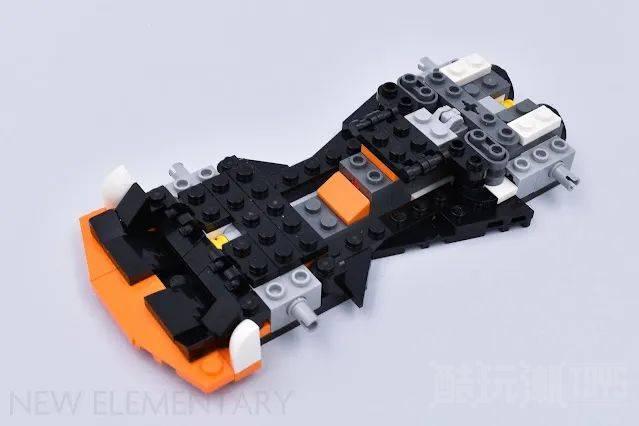 SNOT搭建技巧在车辆的两侧继续延展,我们使用橙色船桨构建了这辆车最明显特征之一,这是对车辆这一独特设计元素的巧妙解决方案。较早安装的橙色机械组插销使侧面的车门的从后向前轻轻倾斜。