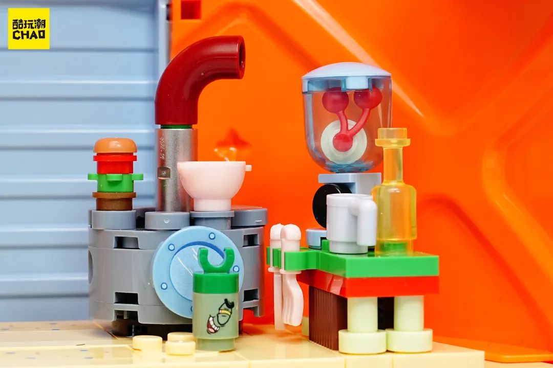 继续向右走,就来到了餐厅和卧室区域。餐厅完美复刻了“蟹堡王餐厅”的经典场景,这部分对应的是1号零件包。
