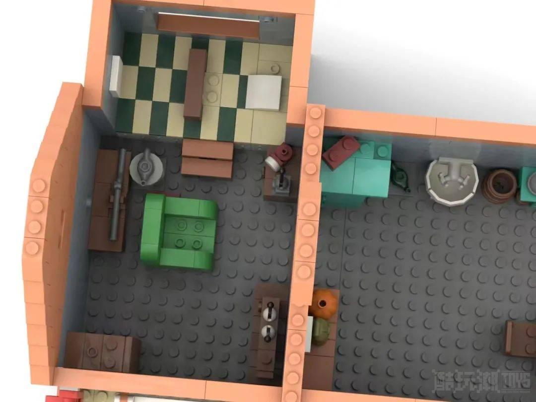 阿楷还补充道:“房屋所有的窗户仿照动画中的中国古代窗户设计,向外推开,没有直接使用乐高官方的窗户零件,其实窗户上是有贴纸的,但是渲染图没有;而屋顶的设计特意请教了G·S大神,使用铰链连接,再使用不同颜色的光面板来还原出房屋经过风吹日晒后老化的效果。”