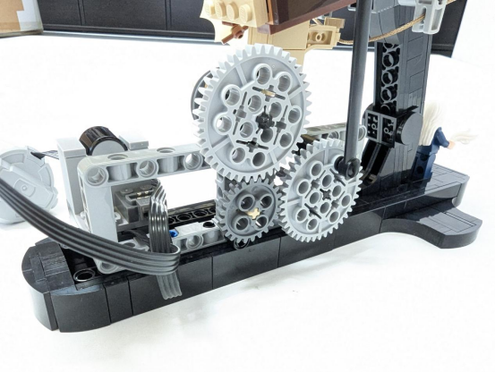 更换底部扳机的“1×2 圆形板”(编号 35480),利用齿轮和橡皮筋设计,模拟扳机的挤压效果,实现尾翼驱动联动。