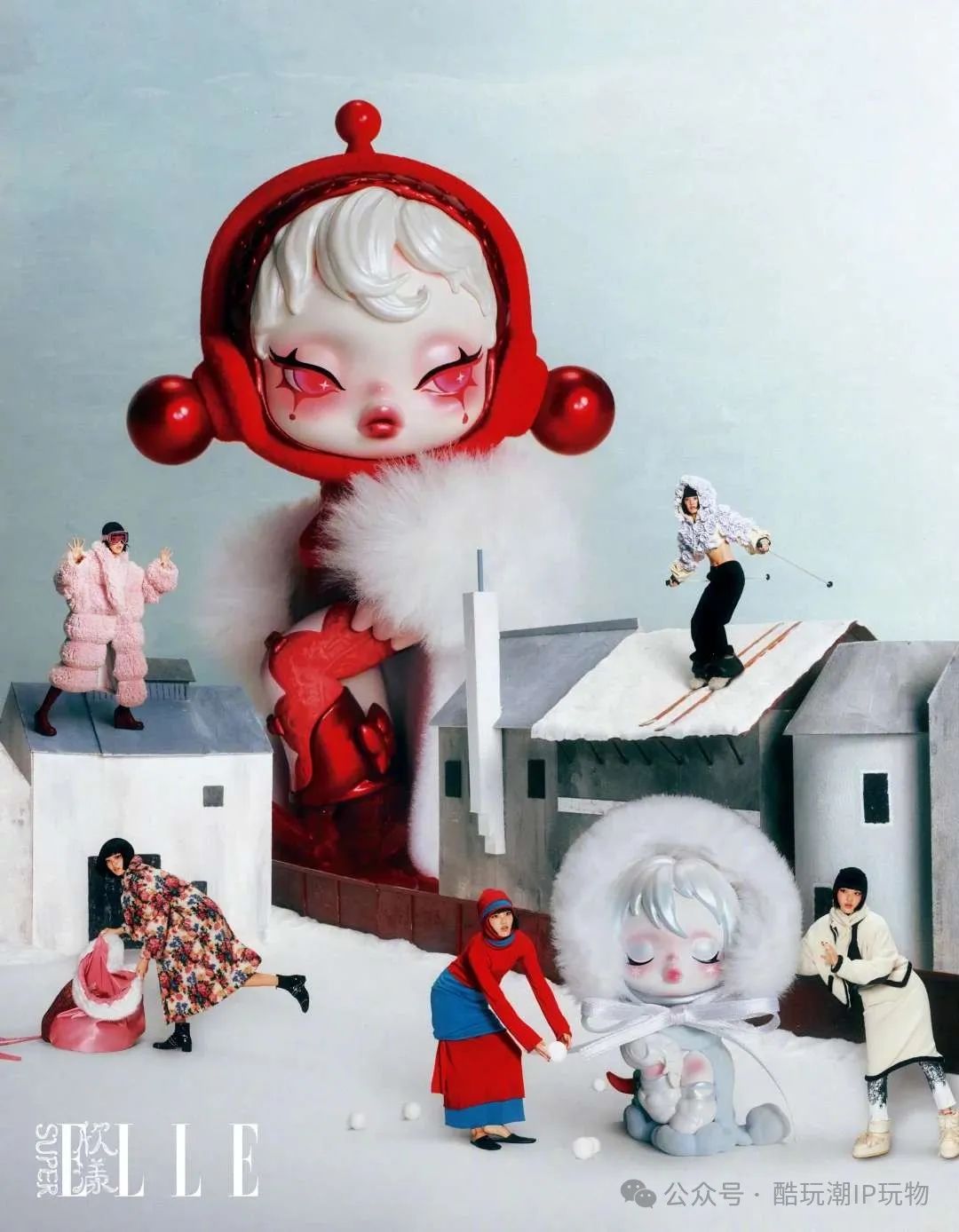 夸张的比例与构图:模特与玩偶之间的比例差距被故意放大,这种超现实的视觉效果使得模特看起来像是与玩偶互动,而玩偶似乎拥有自己的世界。