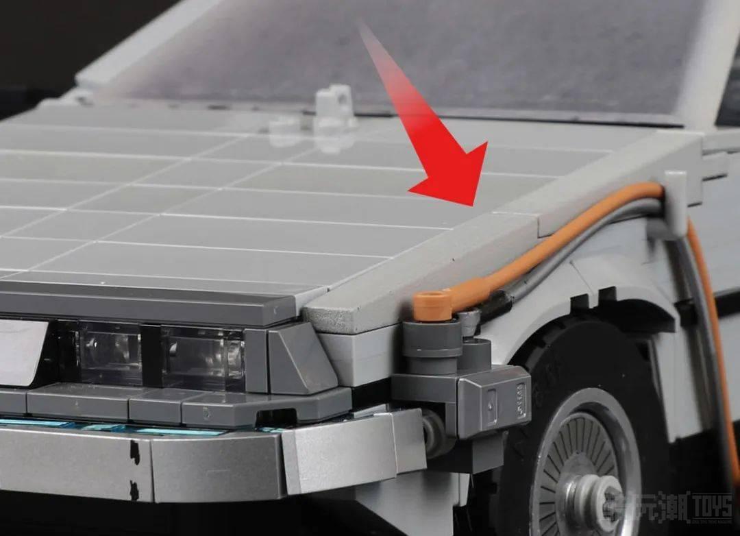 Sven说,用乐高再现标志性的DeLorean DMC-12最大的挑战就是车头的“引擎盖”,由于是后驱车的缘故,前端的传统引擎盖下面并没有发动机,只有储存空间。乐高已有的斜面砖对于这辆车的引擎盖而言都明显太过陡峭,所以他们为引擎盖两侧设计了一个新零件。零件设计师Yoel mazur 尝试了很多种可能的设计,最终确定了这个零件——7螺柱长的斜面砖,放在这里非常完美。