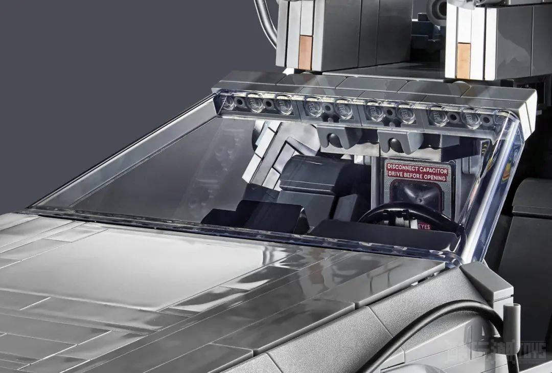 乐高10300套装的另外一个新零件是透明的挡风玻璃,它有6块砖那么高,宽从14个缩减到10个。由于时常会出现类似的玻璃还没开箱就被刮花的事故,所以回到未来套装的挡风玻璃会被单独装袋。但是,根据设计师的说法,这并不是一个长久的办法,因为它不太符合乐高可持续发展的目标。