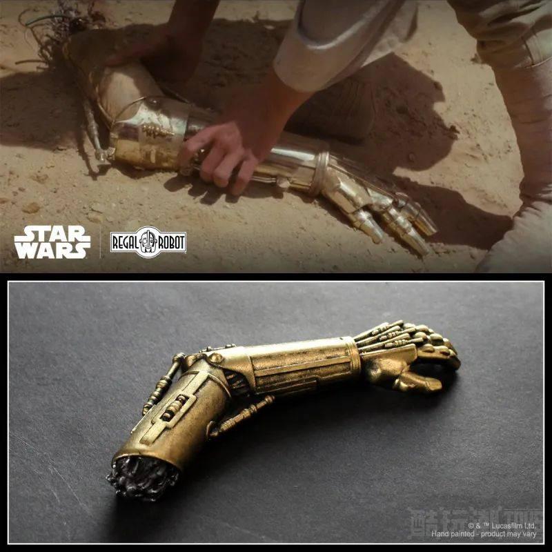 这一款「C-3PO 手臂磁铁」的设计灵感是来自于《星际大战四部曲:曙光乍现》电影前段,路克、R2-D2、C-3PO 遭到塔斯肯(Tusken)人袭击,C-3PO 还直接断了左手臂的情节;本作以迷你的掌中尺寸还原了 C-3PO 金色手臂的各处细节,除了表面的纹理、手指部分的管线机构之外,更以手工涂装表现出逼真的旧化脏污,位于上臂的断面也将电线遭到蛮力拉扯的不规则损坏痕迹给制作出来,是个很有意思的小配件啊!