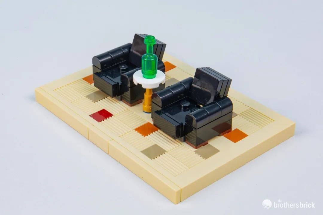 同样,第二个嵌套区域也是侧着拼搭开始的,有一张小桌子和椅子,桌子上面也有一堆螺柱。