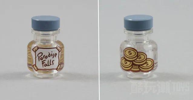 除了人仔,还有一个值得注意的新印刷零件:带天堂瀑布便利贴和硬币印刷的透明人仔头部 (6422742)。正面有“Paradise Falls”标签,而背面有一些美元的硬币。从正面看的时候,圆形的零件巧妙将背面的硬币放大扭曲,给人一种装满硬币的玻璃罐的印象。