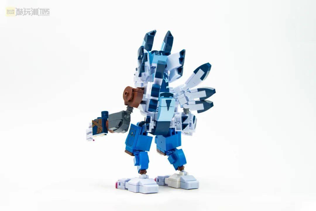 加鲁鲁兽的狼头设计非常巧妙,使用弧形带角的光面板进行线条修饰。而且没有使用常规的印刷零件去做眼睛的部位,只用了两个黄色的圆钮零件,就表现出了加鲁鲁兽冷酷的眼神。