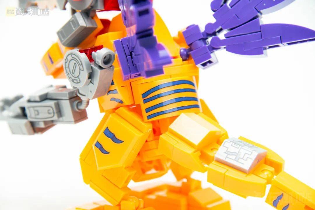 手臂的花纹依然采用UV转印贴纸,让我们能够感觉到它时刻准备战斗的姿态。不过这里还是需要提一下祖顿兽的膝盖处,设计多少有些缺陷,很难完美固定,不知道森宝积木在后续的设计中,会不会改进这个缺陷。