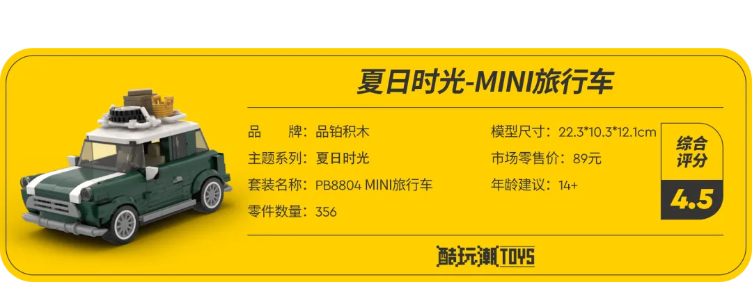 最后安装好车顶和轮胎后,这个套装的拼搭就完成了。夏日时光系列并没有额外的切换玩法,但外形设计上更偏向于女孩子喜欢的MINI车。整体设计简单而不失精致,特别适合作为摆件或者礼物送给喜欢的人。