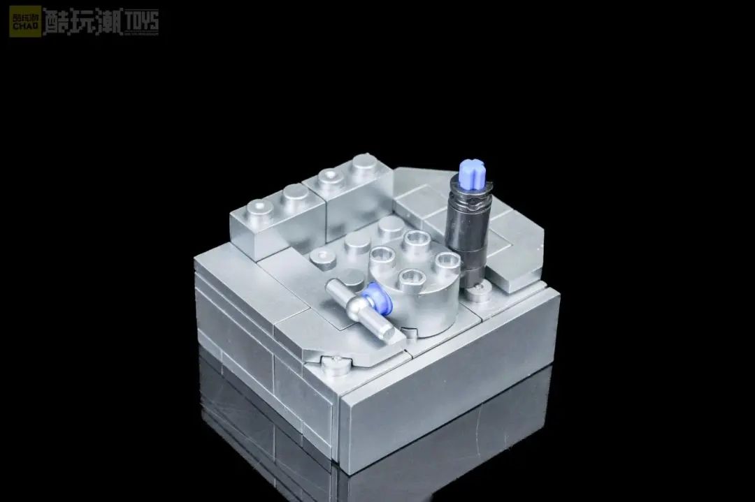 独角机械的盾牌采用纤细的设计,添加的蓝色透明件和红色零件凸显简约精致。背饰采用一代始祖机械动力背包设计。