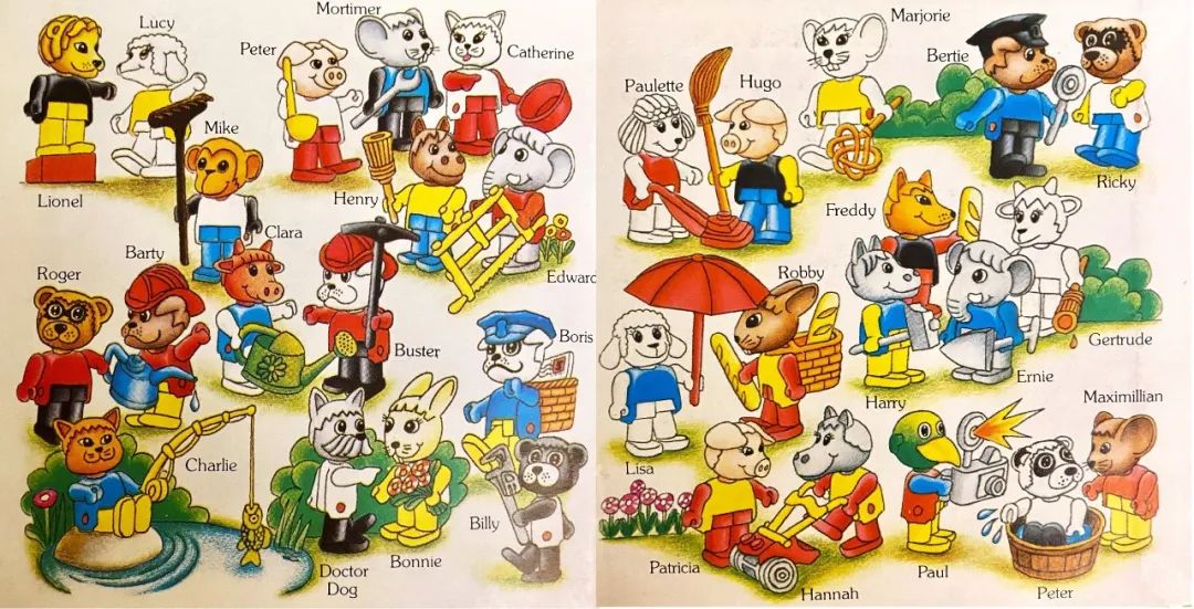 Fabuland套装中的人仔也比较特别:比乐高标准人仔略大,比得宝人仔略小,呈现出不同种类动物的外貌。