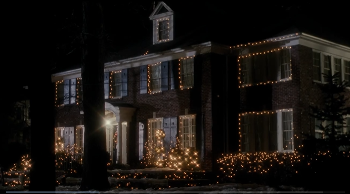 - 门廊上的花环和庭院中的细节也让人瞬间联想到电影的节日氛围。