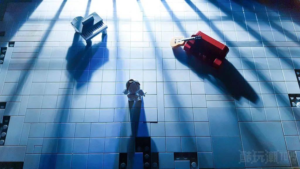 “苍白蓝点”是我用小型LED灯和乐高窗户砖块(特别是带有水平栅栏/门帘的窗框)进行试验的一系列拍摄作品中的一张。我对透过窗户投射阴影的方式非常着迷,结合灯光可以创造出非常大气的效果。我建造了一些简单的墙壁和窗户作为我的布景,“苍白蓝点”就是在这种环境下产出的。拍摄时还用了两盏灯,每盏灯上都有三个LED,一个乐高的太空人坐在窗户前面看着。我最初从人仔后面拍了一些照片,但没有达到可以看到窗框在地板上的全部阴影效果。因此我换成一个高角度,我把窗户本身放弃掉,因此我们现在只能看到光和影打在太空人、一些物体和地板上。隐藏太空人所看的东西可以保持照片的神秘感,一个人从风景中或通过窗户向外看的构图在浪漫主义中是十分常见的。我在Photoshop中处理了图片,并使用了各种滤镜,最终确定了一个非常蓝色、冰冷或空灵的滤镜。我对这张照片的效果相当满意,因为一开始并没有一个强烈的想法,主要是通过对光源和相机视角进行反复实验达成的。有一点我还要提一下,我在编辑照片时播放了一些环境音乐,我想这有助于我从原始拍摄的照片中选出梦幻般的滤镜。