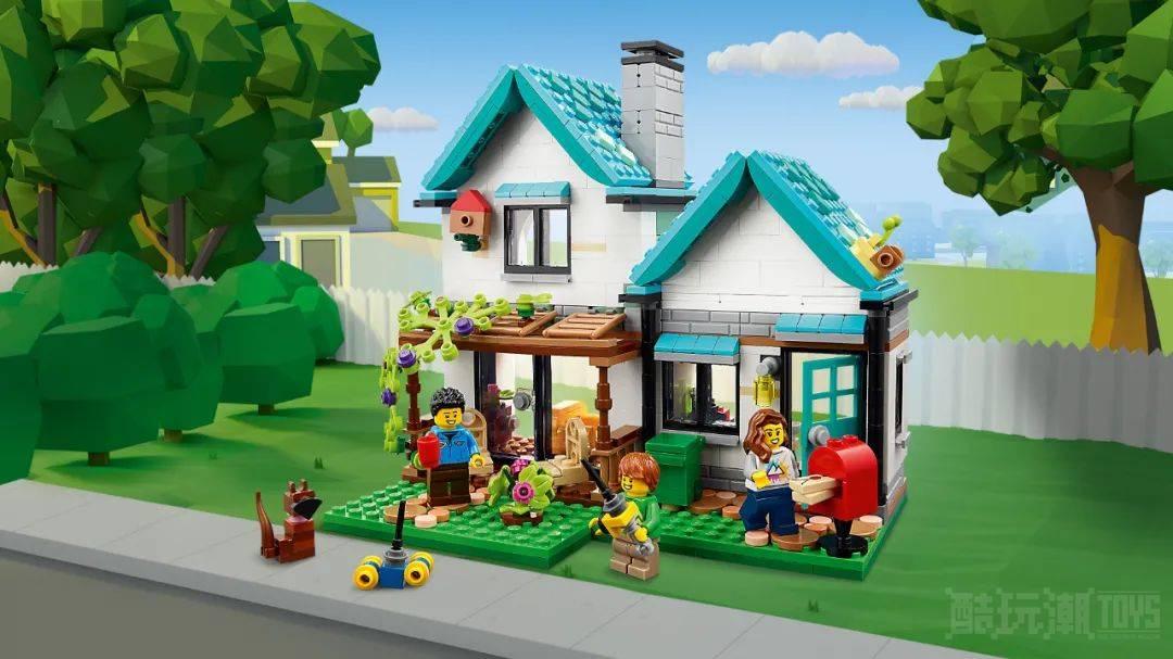 31139 舒适别墅是2023年3月的新品之一,包括808片零件和3个人仔。这座房子采用醒目的白色和蓝绿色的配色方案、有充足的内部空间以及精致的细节,如垃圾桶和蜗牛。
