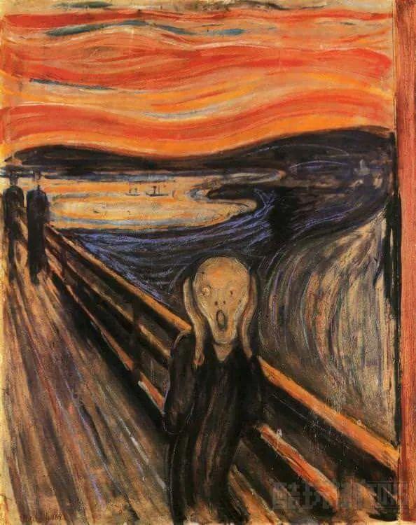 你肯定看过这幅画,血红色日落下的桥边,一个人捂着耳朵张着嘴巴似乎在喊什么,满是孤独和绝望之情,便是挪威画家爱德华·蒙克1893年创作的绘画作品《呐喊》。