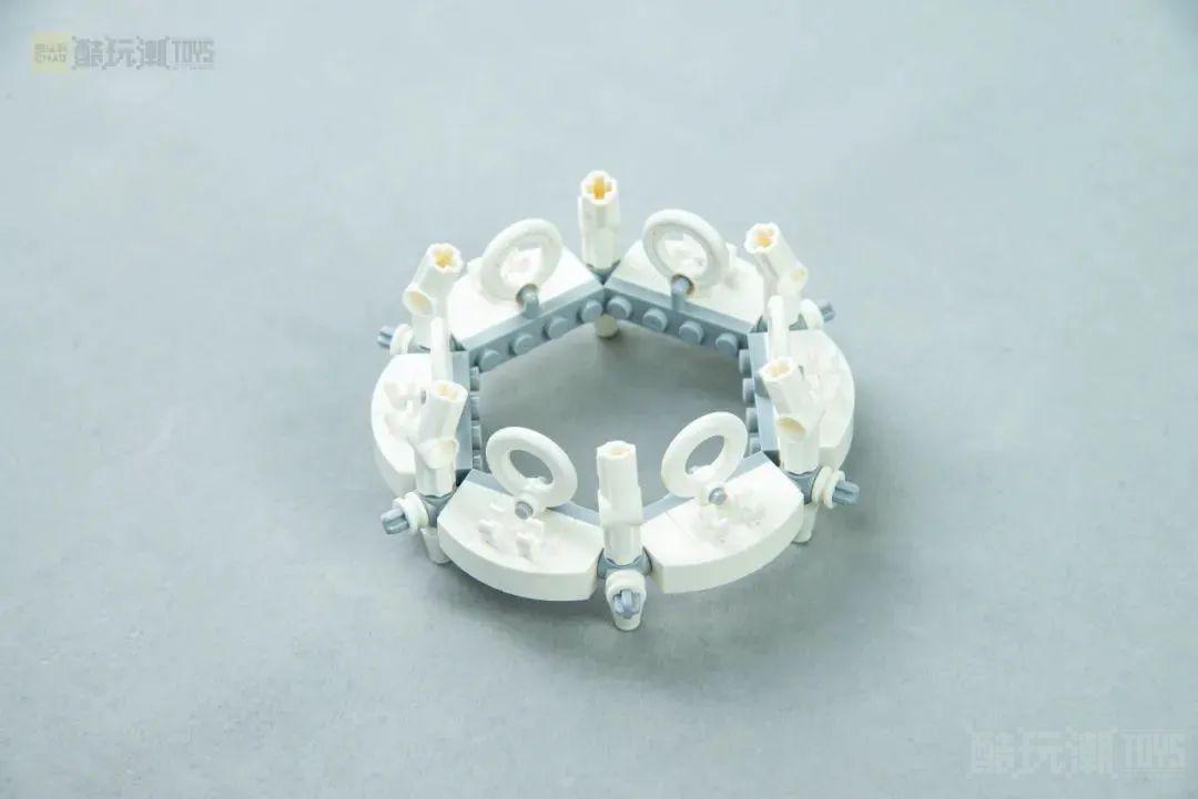 在我们之前的测评文章中详细介绍了这座坐落在精灵锻造厂上方的凉亭,它外表看上去使用了复杂的SNOT技术拼搭成的圆形凉亭底座,再用白色的藤蔓和圆环零件组成了凉亭的屋顶,结构看起来可能很简单,但就是这么一个看似不复杂的小建筑让设计师们吃尽了苦头。