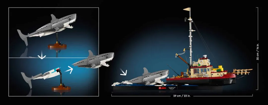 该套装再现了第一部《大白鲨》电影中最具标志性的载具——Orca号,这是一艘由古怪的昆特船长驾驶的捕鲨船,该模型高约35厘米,并配有拼搭的布鲁斯鲨鱼模型,以及为捕鲨献出生命的三名电影角色的人仔:布罗迪警长、马特·胡珀和昆特船长。