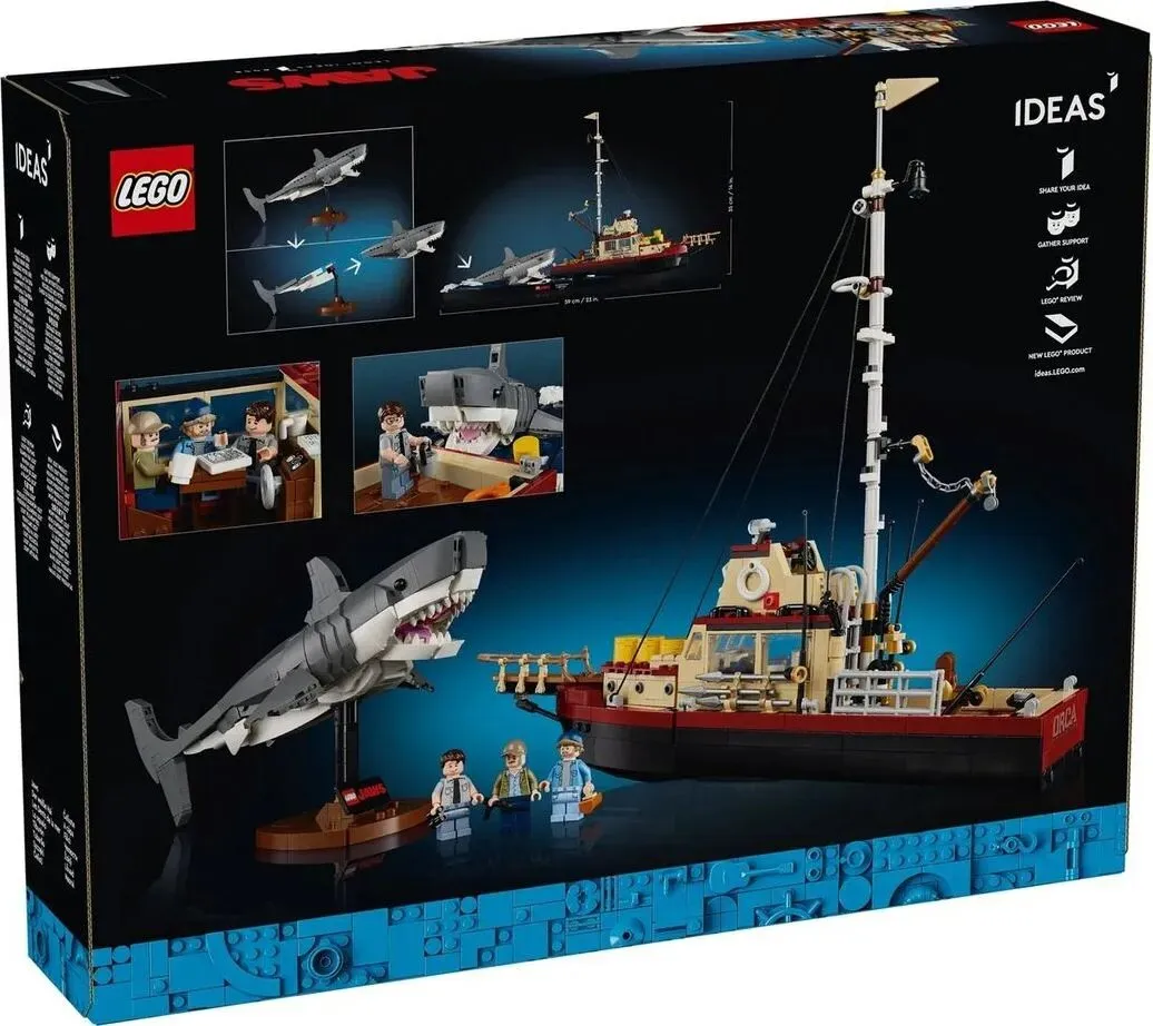 该套装再现了第一部《大白鲨》电影中最具标志性的载具——Orca号,这是一艘由古怪的昆特船长驾驶的捕鲨船,该模型高约35厘米,并配有拼搭的布鲁斯鲨鱼模型,以及为捕鲨献出生命的三名电影角色的人仔:布罗迪警长、马特·胡珀和昆特船长。