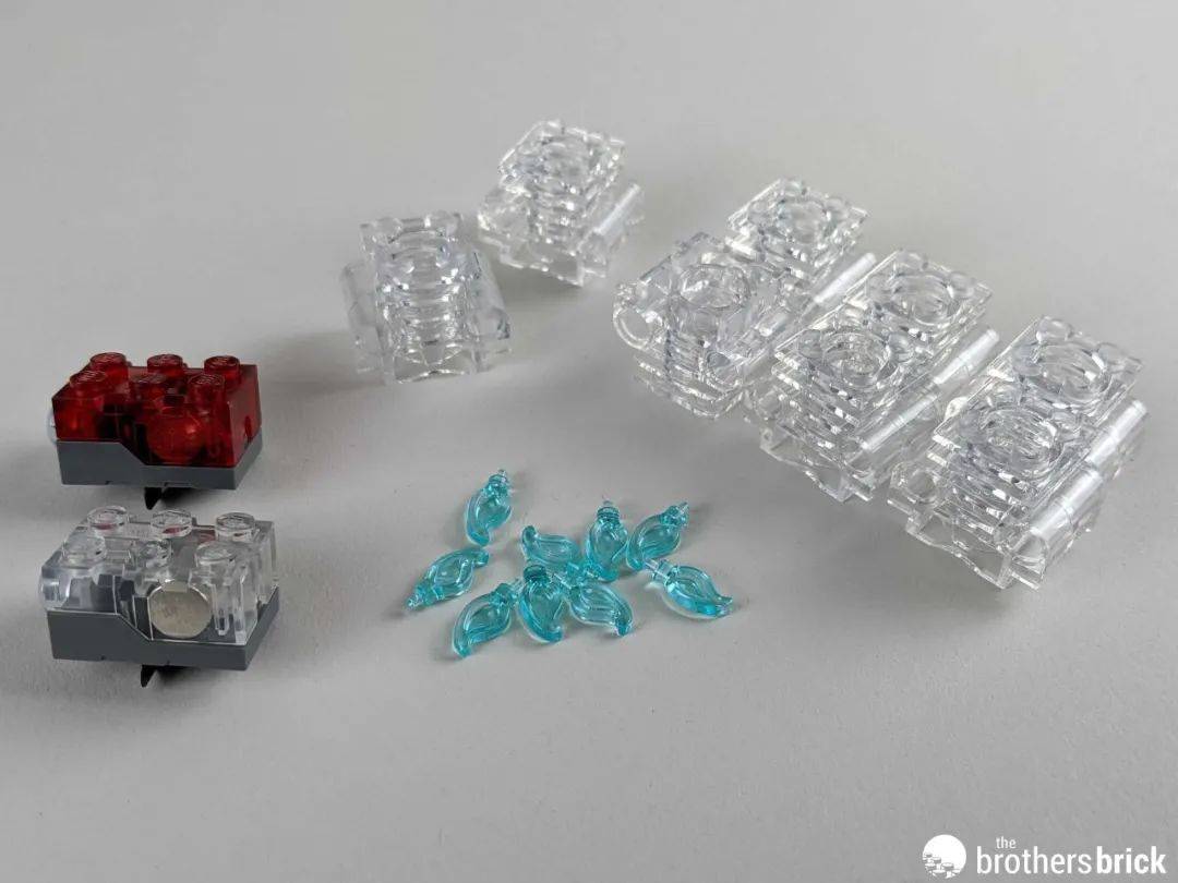 这套模型主要是普通的黑色(有时是很深的灰色)零件,但也有一些不一样的元素。根据你的零件库的规模,这可能会是你第一次看到透明的发动机组零件。还有两个发光砖(一个红色,一个黄色)和一些浅蓝色的透明蜡烛火焰。