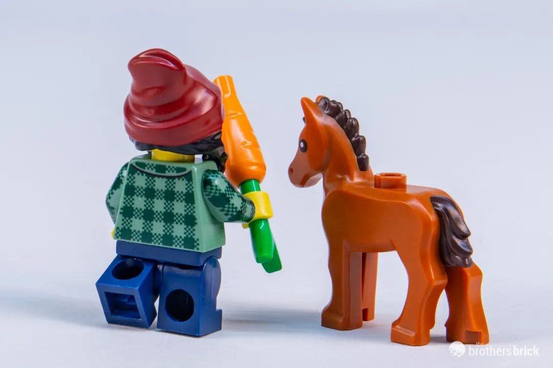 小马驹是棕色双模设计,有深棕色的鬓毛和尾巴,吸取并升级了乐高已有十年历史的马儿站立姿势设计。它的脚之间距离为三个半螺柱,背部有一个单螺柱作为连接点。