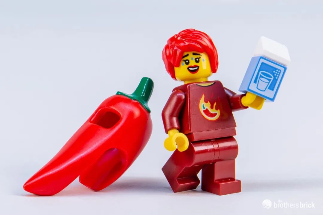 在辣椒装下面,这位女士有一套暗红色的衣服,上身带着燃烧辣椒图案,还有一个红色的人仔发饰。她有一个双面表情头部,上面有一张笑脸和一张因太辣而大汗淋漓的表情。有趣的是,她很明智地带着一盒牛奶,因为这是减少辣度的最佳办法。印着牛奶的天蓝色1×1砖是去年发布的,已经在一些套装中出现过了。包装袋中还包括一个备用的白色起司砖。