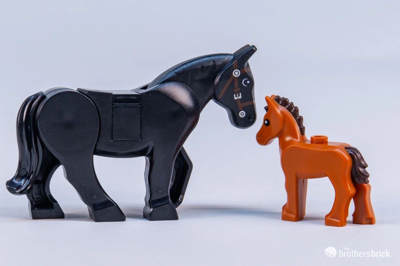 小马驹是棕色双模设计,有深棕色的鬓毛和尾巴,吸取并升级了乐高已有十年历史的马儿站立姿势设计。它的脚之间距离为三个半螺柱,背部有一个单螺柱作为连接点。