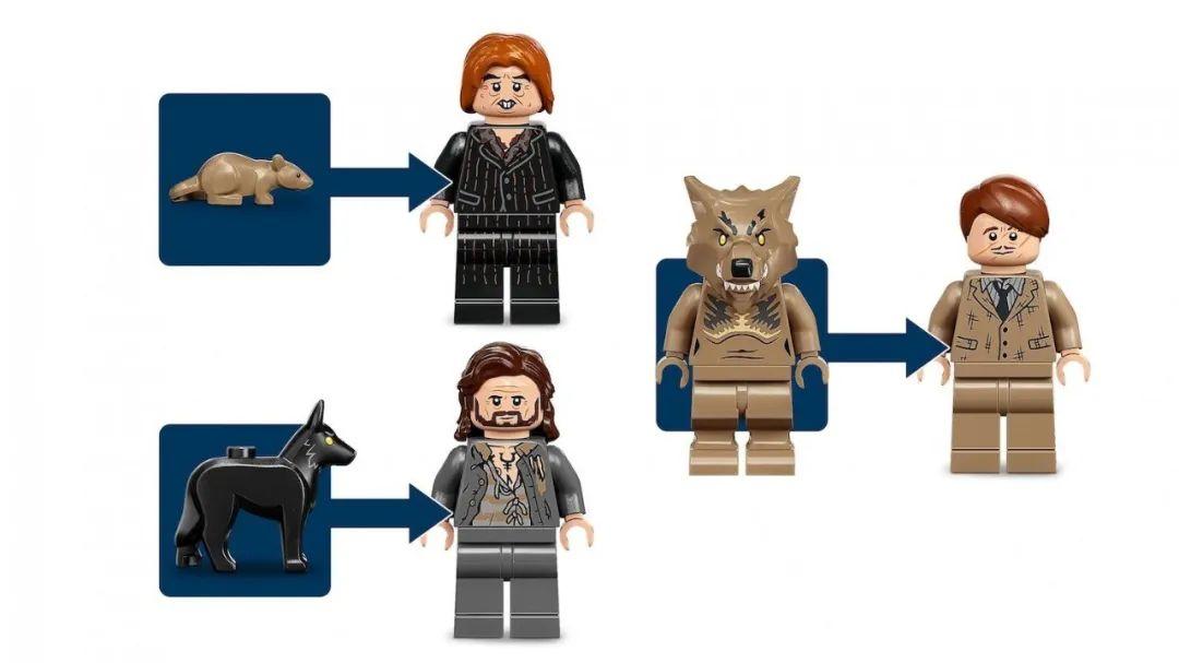 我们会在这套模型中得到哈利·波特、赫敏·格兰杰、罗恩·韦斯莱、小天狼星·布莱克、小矮星彼得和莱姆斯·卢平,以及小天狼星和彼得的灵媒形态和卢平的狼人形象人仔。一只黑狗代表“Padfoot”,一只老鼠代表“Wormtail”,还有一个完整的带有狼头的人仔代表“Moony”。