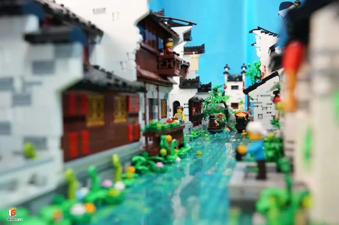 水面用乐高透明砖层层铺设,模拟江南水系波光粼粼的质感。