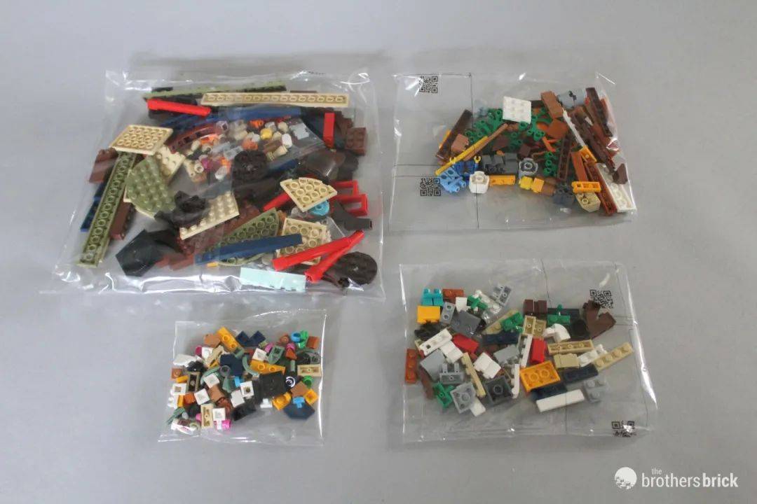 零件中有一些很有趣且不常见的元素,包括几个土绿色的香肠,几根黑色的树枝(包括备用的),酷酷的新1x2x1浅灰色半圆砖块,以及漂亮的印花颗粒。虽然香肠在一些套装中出现了,但树枝和半圆砖却只有几套中有。当然,漂亮的印花颗粒是套装独有的,因为它很不错,所以如果有一天它出现在别的套装中我也不会惊讶的。