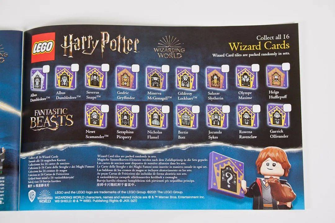 这些随机包含在每件套装中的巫师卡是什么呢?就像右下角罗恩所展示的那样,它们来源自巫师界流行的糖果——巧克力蛙(在小说中,这种糖果包装中就内附有巫师卡片,介绍著名巫师及事迹,贡献)。看来比隆的设计师们觉得这是一个巧妙的主意,所以沿用到了套装中。在每一个新的乐高哈利波特套装中都包括着这样的巫师卡,一共有16块,它们是“随机”出现的。