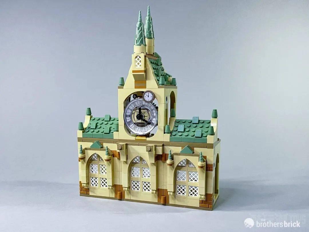 拼搭的最后一部分集中在钟楼结构。 这里的风格与2019年的小版本有些吻合,但旋转时钟的机制不同。这里应该是为了更好地与电影版相匹配,但比例缩小之后总会有所取舍。