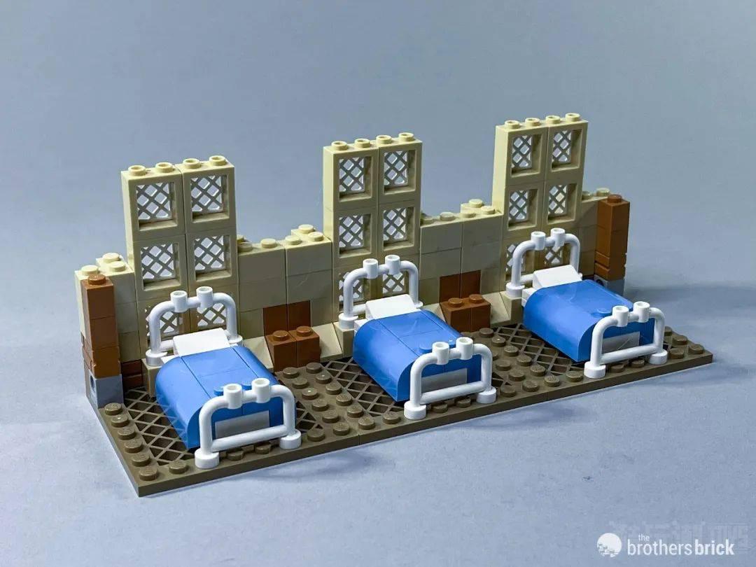 从这里开始,拼搭的重点是椽子结构和相对的外墙。其中一张贴纸是用来制作病人信息表的,庞弗雷夫人可以拿着它,但摆放在床脚看起来更好。同时,外侧使用拱门和钻头来制作城堡外部的石雕。在2019年之前的钟楼套装里,类似的床(中间有蓝色隔帘)出现在顶层,表明那里也是医院侧翼,但缺少其他细节。