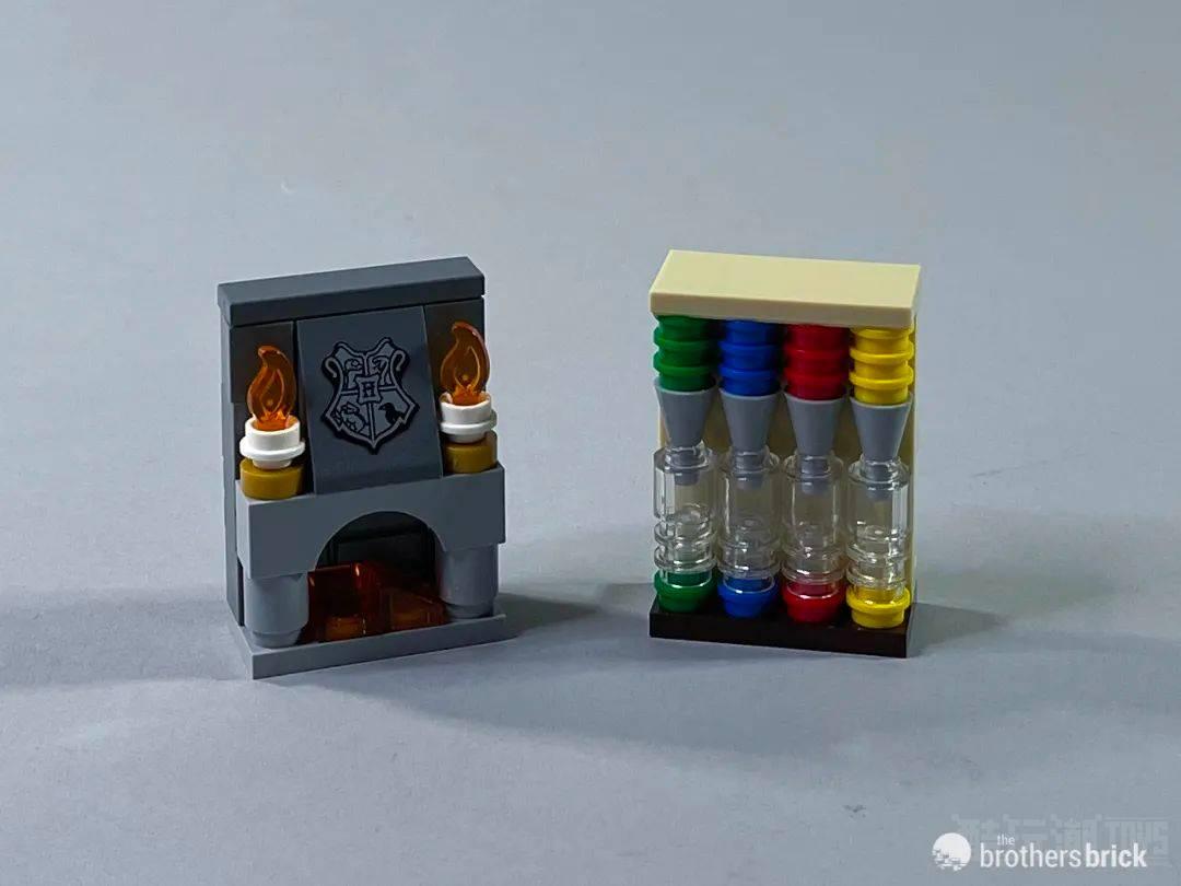 另外两件家具是棕色墙上的衣柜,以及墙上的烛台(贴纸)。其中的一些物品,比如沙发和长椅,可以被改造成其他物品,比如舒适的椅子。我们还得到了一个重新着色的张开翅膀的猫头鹰,以及一个分院帽。还有一个带平盖的金箱子,以及两张新的2×3印刷光面板,上面有活点地图和《唱唱反调》杂志封面。《高级药剂制作书》的贴纸是新版书籍的封面,以前的封面是粉蓝色的,有复古风格,没有文字。最有趣的是钥匙环和钥匙,下面让我们开始拼箱子,这样就可以向你展示如何使用它了。