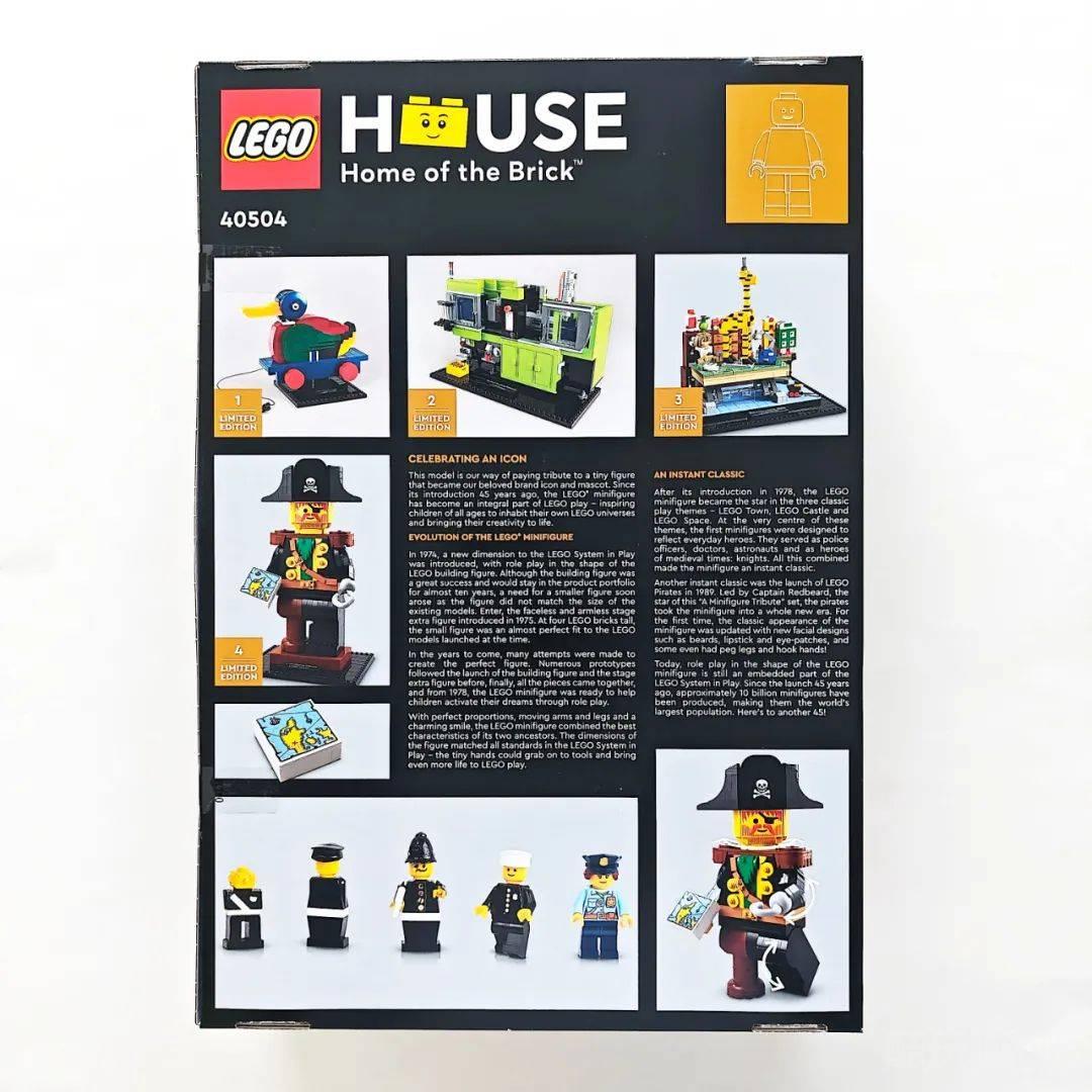 盒子的背面记录着前三款乐高之家限定套装和这只红胡子人仔的更多细节照片。文中部分描述了关于乐高人仔诞生45周年便有了这款致敬人仔的套装,同时还介绍了乐高人仔的演变史和一些精彩的瞬间。