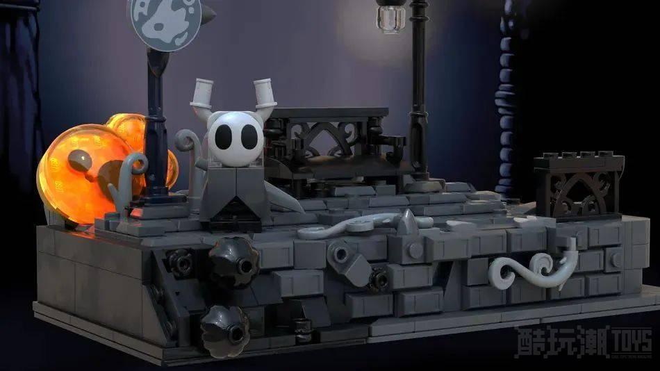 作者尝试着在这个较小的场景模型中添加上尽可能多的游戏细节,例如游戏第一章节中的长凳、长椅旁的路灯、赛格威鹿角标志和发光的圣巢,所有的部件都被安装在一个深灰色的底板上。长椅还是《空洞骑士》中分布在圣巢各处的存档点。