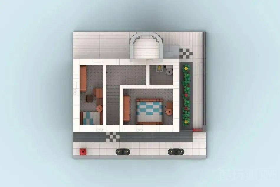 从作者给出的俯视图可以计算这个建筑的尺寸是42×40个颗粒,使用了普通的板零件作为底板而不是32×32的街景薄底板。所以这是一件单纯的建筑作品,而非乐高街景的模块化建筑。