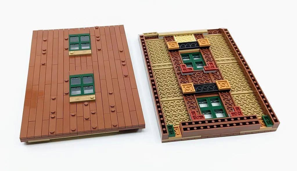 A形木屋的上层阁楼是一个单独的空间,一层是另外一个房间。两个部分只通过几个带有两个凸点的1×4板件固定,这里的设计类似于街景套装中楼层的连接方式,可以让我们将两层轻松打开。不过这里要注意的是,要想把整栋建筑移动的话,还是要托底,切记不要单独去拎着上层就开始移动。