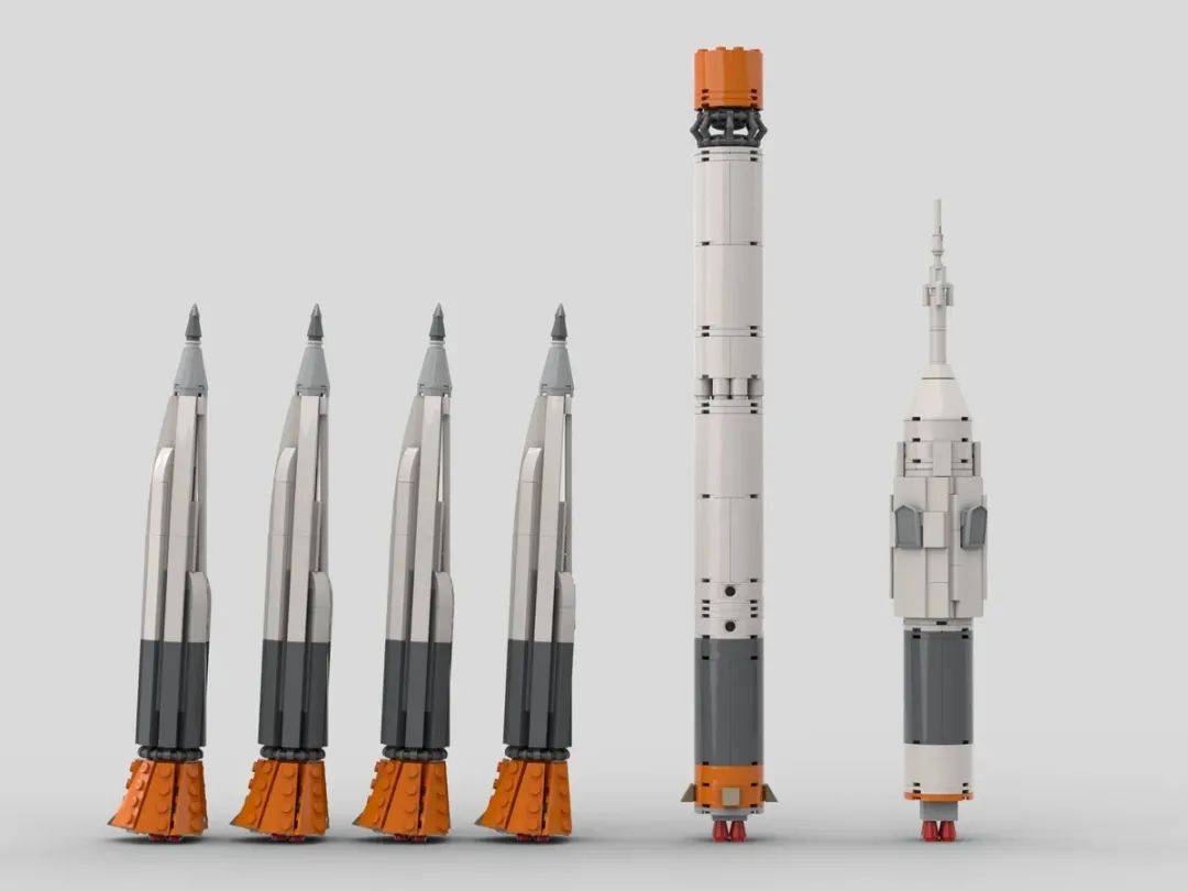 现在的火箭设计考虑到了三个推进阶段和太空旅行者乘坐的太空舱。作品介绍中并没有提及模型总共用了多少零件,但从图中粗略估计,大约在1000-1500片之间,模型高度大约估计是75厘米。