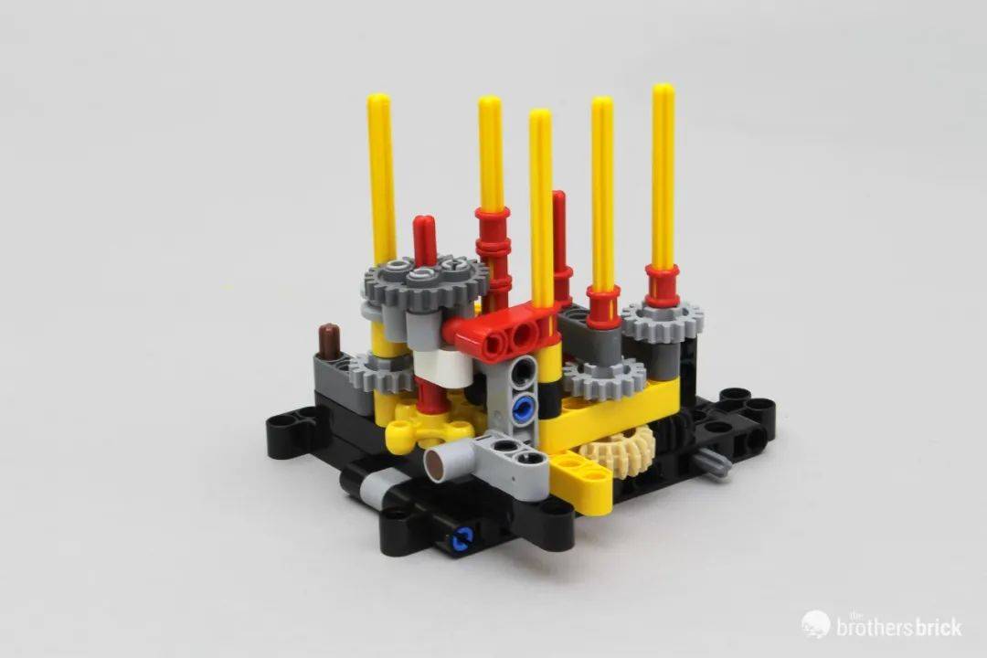 把变速箱封闭起来是有点儿困难的,从理论上讲,你需要把至少11个轴和销的组合同时穿过一堆孔。如果你曾经拼搭过一个机械组模型,就会知道光摆好这些线条就很难了,更不用说让它们老老实实地一起就位了。另一方面,模型中的新垂直孔臂在保持紧凑型方面真的很好用。