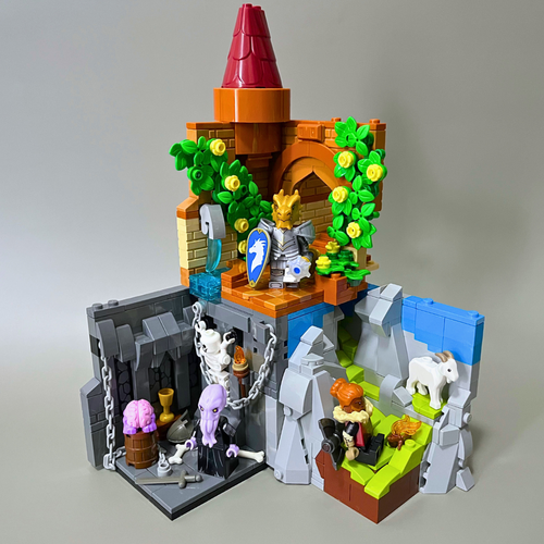 经典的 SNOT 技巧解决了连接蝴蝶的问题,他还从最近的中世纪 MOC 中借用了一个树木部件,让丘比特能够从树上飞下来。