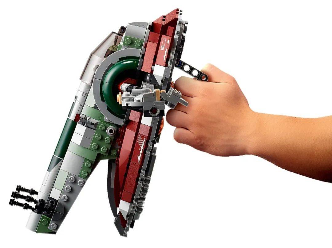 星舰可以用背面的小把手握住,这应该使孩子们把玩起来很舒服。像原型一样,机翼随着飞船的位置而旋转,当然,它也有一些凸粒发射器。波巴·费特的飞船如果没有一个被冻在碳酸盐中的人物,当然就不完整了,在这种情况下,是一个加莫人,估计是贾巴的卫士之一。该套装还包括一个滑翔机,由于有一个折叠梯子,它可作为飞船的支架。
