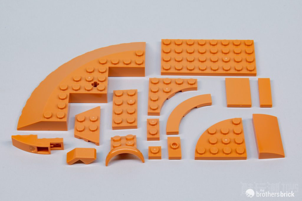 挡风玻璃是唯一一个全新的零件,但也有一些其他值得注意的砖块。这件套装是橙色砖块的“金矿”,有302个零件分布在下面的16个元素中。其中有一些零件在这件套装中被重新着色,如挡泥板。