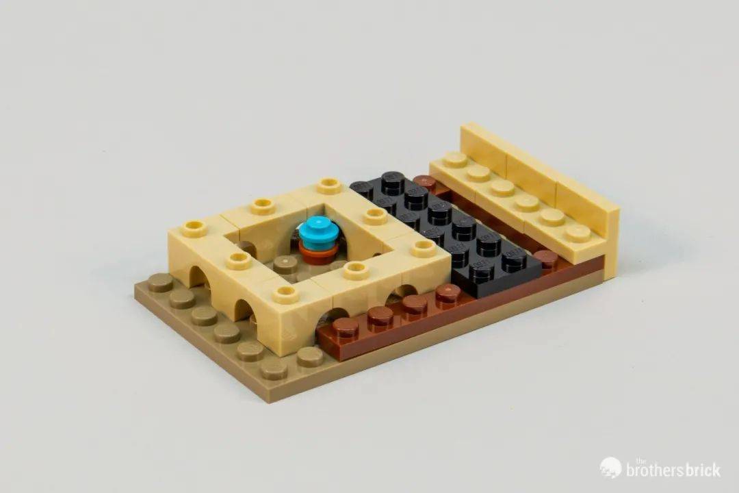 拉尔斯之家的大部分建筑是在地下,中间有一个大型的开放式中庭,所以这部分的结构是用乐高最新的拱门砖块拼出来的,创造出中庭四周的洞形走道。拱门之间还形成了一个正方形的院子,稍后直角元素会让它变得圆一些。由两个螺柱叠在一起组成的贝鲁阿姨正坐在这里看着院子的风景。
