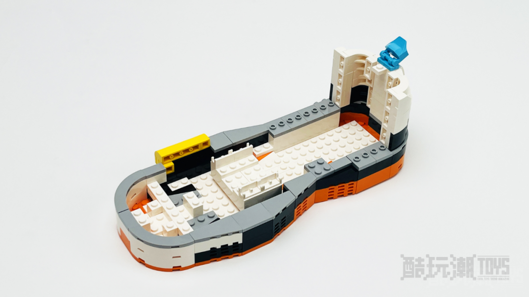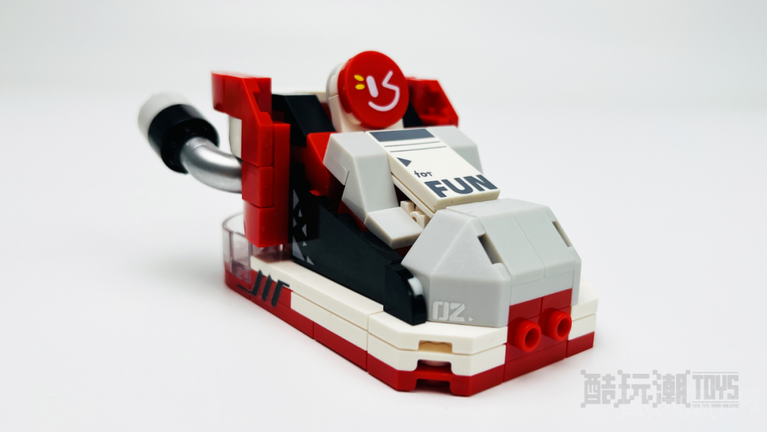 红色的鞋底,白色的鞋帮,具有一些层次感。透明的白色零件拼装在尾部,搭配喷射器来看,像是某种清洁能源存储罐。小鞋的内部同样是中空结构,鞋帮、鞋舌处都有贴纸或印刷砖为其增加细节。流线型的鞋身很棒,或许它真的是来自哪个“鞋子星球”派来的飞船吧!