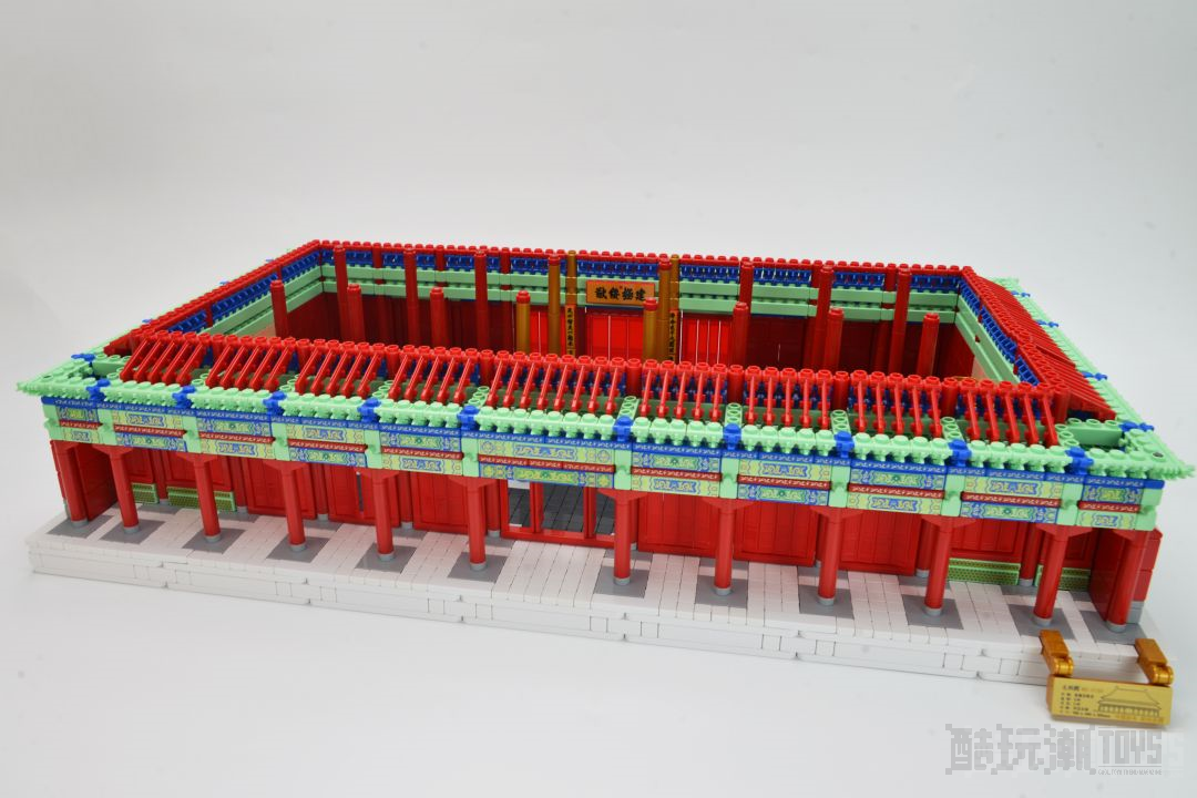 这不愧是布鲁可首款收藏级作品。从细节还原度的角度来说,无论是脊兽或者瑞兽,还是“三交六椀”菱花样式的门窗,额坊上的和玺彩画,斗拱等,都被高度还原。在配色上采用金黄色瓦片,蓝绿相交的斗拱与和玺彩画,红色门窗,墙砖,柱子,最后以白色台基作为底色,产生华丽、雄壮的中国风之美。额坊上数量庞大的和玺彩画印刷件采用成本更高、效果更好的UV印刷,以最好的状态呈现我们眼前。