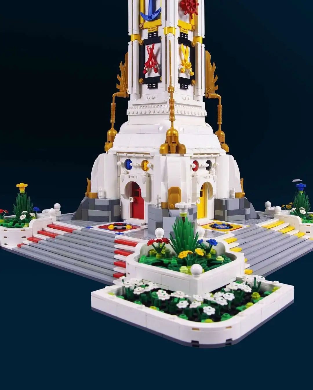 尖塔顶端的金色罗盘不仅提升了整体高度,也象征着指引未来的方向,成为视觉的制高点。底座周围的小花园和精致的台阶设计,为建筑增添了自然气息和生活感,使整个场景更加立体生动。